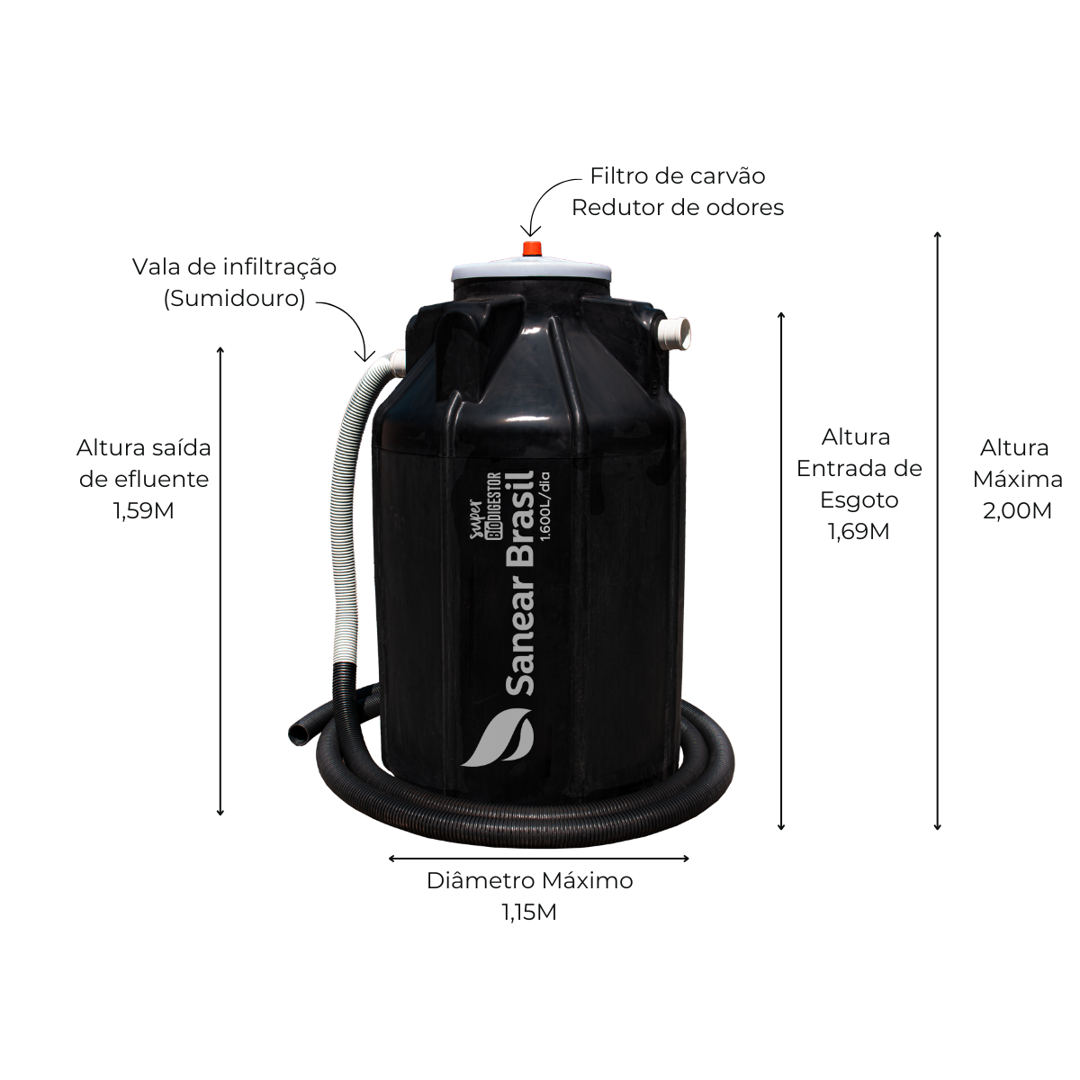O Super Biodigestor 1600L da Sanear Brasil é a solução definitiva e mais completa para o tratamento de esgoto de alta demanda. Com seu exclusivo sistema 4 em 1, ele já inclui o sumidouro, garantindo uma instalação simplificada e uma solução completa em um único produto. Ideal para residências amplas, pousadas ou comércios com até 16 pessoas, esta fossa ecológica oferece máxima eficiência, economia na obra e total conformidade com as normas ambientais. Escolha a praticidade e a performance do sistema 4 em 1 da Sanear Brasil.